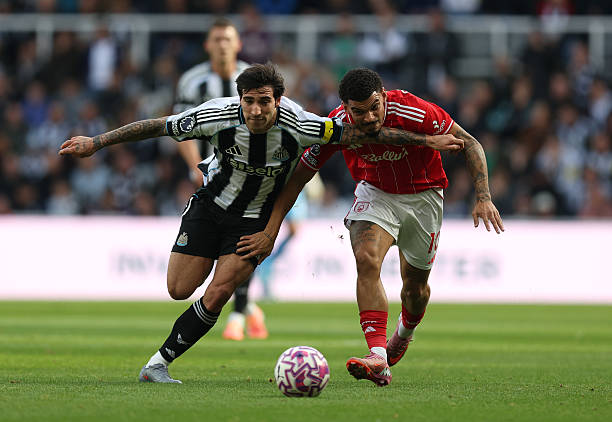 NEWCASTLE UPON TYNE, ENGLAND – OCTOBER 05: Sandro Tonali of Newcastle United Morgan Gibbs-White of Nottingham Forest battle for possession during the Premier League match between Newcastle United and Nottingham Forest at St James’ Park on October 05, 2025 in Newcastle upon Tyne, England. (Photo by George Wood/Getty Images)