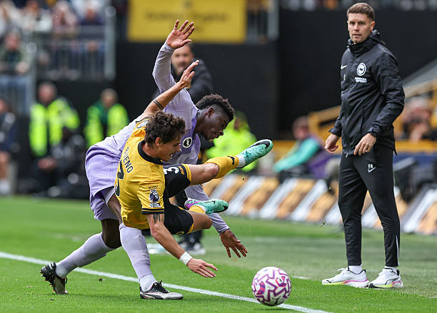 WOLVERHAMPTON, ENGLAND – OCTOBER 5: Wolverhampton Wanderers’ Hugo Bueno is fouled by Brighton & Hove Albion’s Carlos Baleba with Fabian Hurzeler looking on during the Premier League match between Wolverhampton Wanderers and Brighton & Hove Albion at Molineux on October 5, 2025 in Wolverhampton, England. (Photo by Lee Parker – CameraSport via Getty Images)