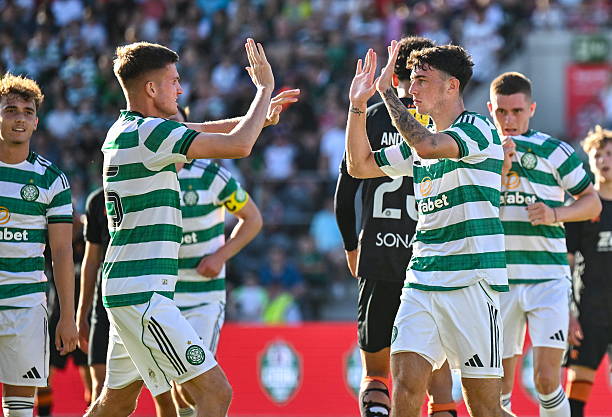 CORK, IRELAND – JULY 08: Celtic’s Colby Donovan (R) celebrates with Mitchell Robertson (L) after scoring to make it 2-1 during a Cork Super Cup match between Cork City and Celtic at SuperValu Páirc Uí Chaoimh, on July 08, 2025, in Cork, Ireland. (Photo by David Fitzgerald/SNS Group via Getty Images)