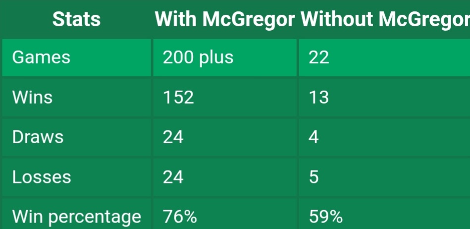 Since taking over the armband, McGregor has missed only 22 matches, with Celtic losing five of those — meaning they suffer a defeat roughly every four games on average.